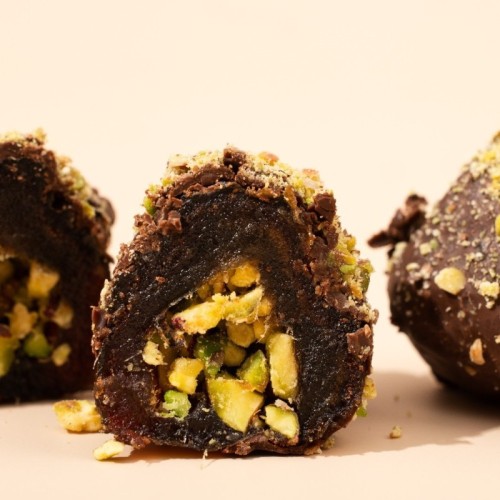 Te presentamos estos Datiles Medjool rellenos de pistacho tostado y salado, bañado en chocolate semiamargo y espolvoreado con polvo de pistacho. Un camino de ida, Contienen 3 unidades de Datiles. Sofisticado, elegante y único